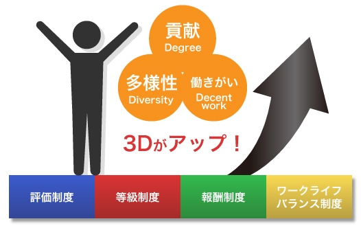 今回の制度は、多様性(Diversity)貢献度(Degree)働きがい(Decent work)という3つの”D”を重視して作りました。誰もが定年まで働き続けられ、活躍できる制度、そして会社に貢献している社員にはしっかり報いる制度を構築し、結果として皆に働きがいを持って欲しいという想いを込めています。