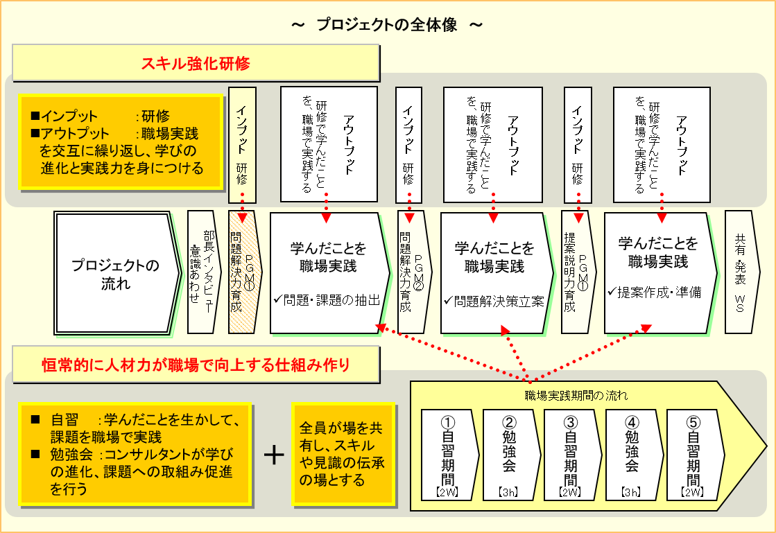 自本部に在籍している全社員を対象に、現行の職制を活用したアクションラーニング形式による「プロフェッショナル人材育成」と「人材・組織力強化のしくみ作り」及び「ナレッジ整備・新サービス開発」のための約半年にわたるプログラムを導入しました。