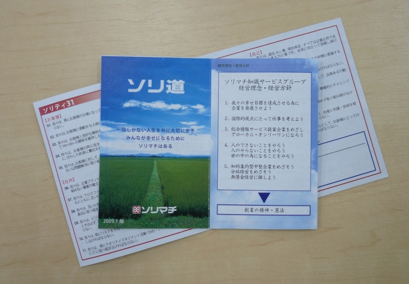 このタスクフォースチームに、役員や幹部が関与すれば、より早く、より良いと思えるものが作れたかもしれません。しかし今回は、役員や幹部がタスクフォースチームの活動に関与せず、プロジェクトを進めました。結果として、タスクフォースチームのメンバーや他の社員達が主体的に活動してくれ、また良い意味で今後に繋がる課題意識が社員の中にも生まれ、役員や幹部が関与して作る以上に、良い結果をもたらしました。また、このプロジェクトの集大成とも言える「考え方・価値観をまとめた小冊子」は、全社員から名称を募り、“ソリマチの道”からとった『ソリ道』。具体的な行動指針であり、私たちのアイデンティティとなる部分は、英語で“状態・性質”を表す「~ty」を用いた『ソリティ31』を採用しました。この小冊子の名称を決定していく過程は、私たちの原点である”農家への支援”を思い出すきっかけにもなり、私たちの原点の象徴とも言える”田んぼの畦道”の写真を、『ソリ道』のデザインに採用しました。