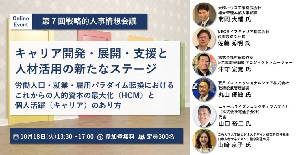 本シンポジウムではこうした問題意識を問うべく、新たなモデルを立ち上げ実践している企業【大和ハウス工業・NECライフキャリア・村田製作所・双日プロフェッショナルシェア・ニューホライズンコレクティブ(株式会社電通子会社)】および山崎京子教授(立教大学大学院ビジネスデザイン研究科)をお迎えし、「キャリア開発・展開・支援と人材活用の新たなステージ」をテーマに、取り組みについて発表、パネルディスカッションを行います。