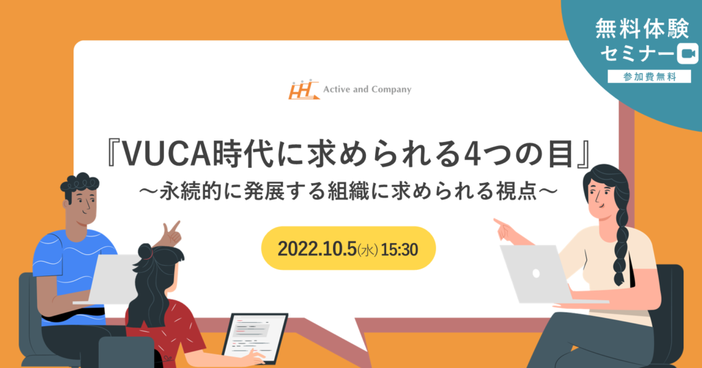 本セミナーでは、VUCAの時代に求められる「4つの目(鳥の目・虫の目・魚の目・蝙蝠の目)」についてお伝えするとともに、組織の永続的発展に必要な人材育成について解説致します。