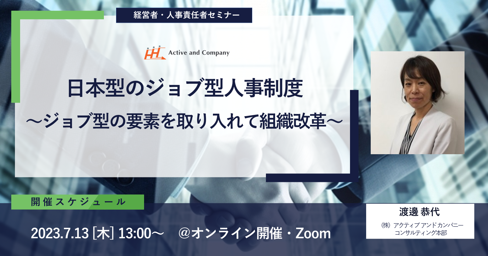 本セミナーでは、日本企業にあったジョブ型の要素を取り入れた人事制度をどのように設計・活用して組織をマネジメントをするか紹介します。