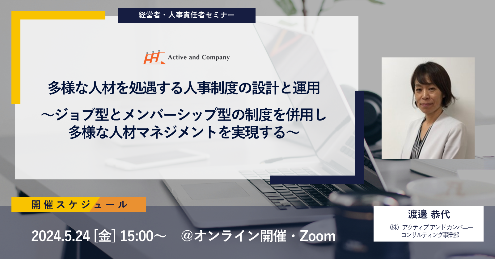 本セミナーでは、専門人材などジョブ型雇用が適している人材、新卒採用人材などメンバーシップ型雇用が適している人材など、それぞれの雇用の本質と特徴を理解し、人材層にあった制度をどのように設計し、運用するか紹介します。