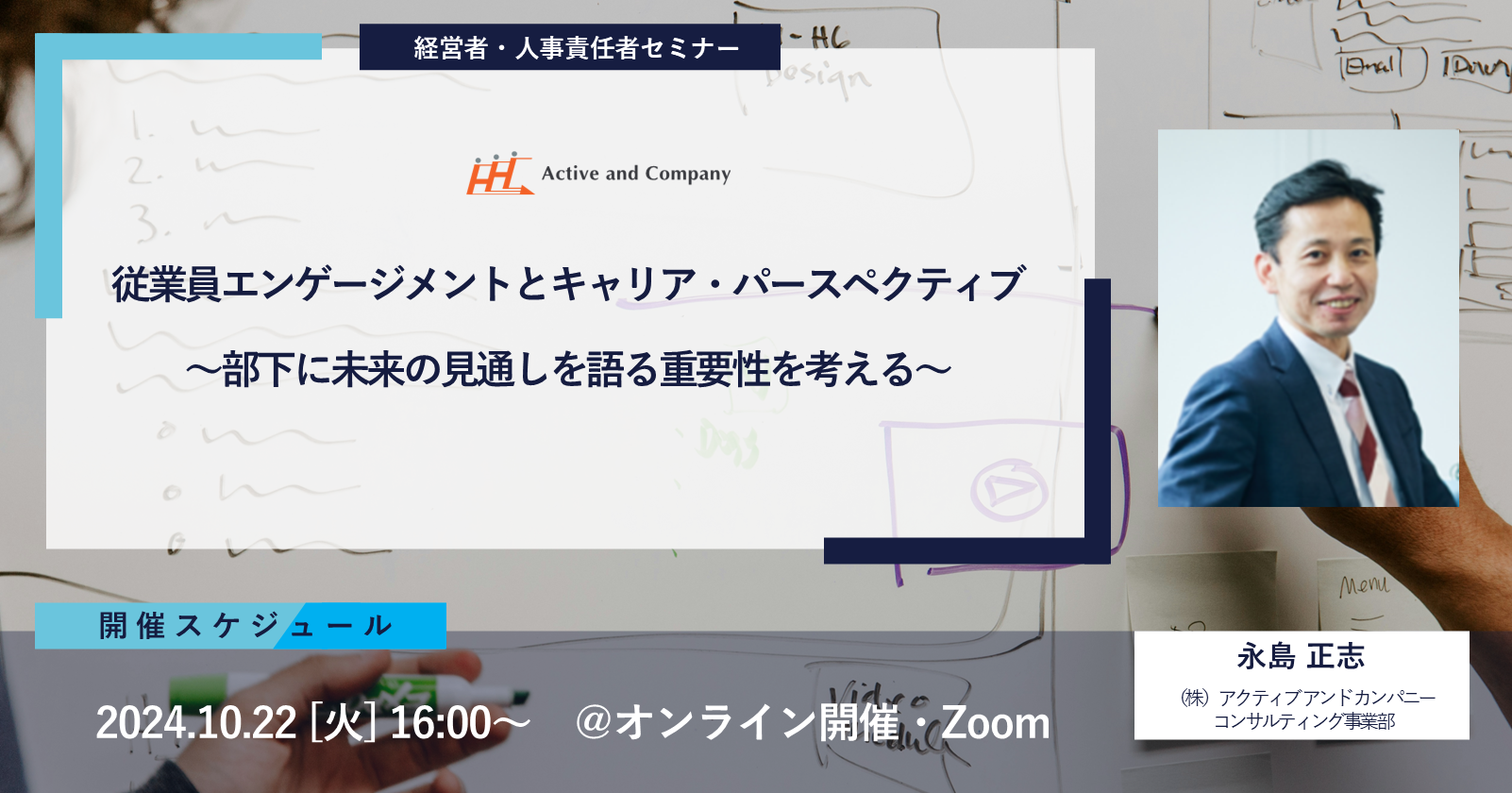 本セミナーでは、離職率の改善や従業員エンゲージメント向上のヒントとして、「キャリア・パースペクティブ(自分の人生における職業人生を中心とした生き方の実現可能性が加味された、短期的・長期的見通し)」と、部下に未来の見通しを語る重要性についてご案内いたします。