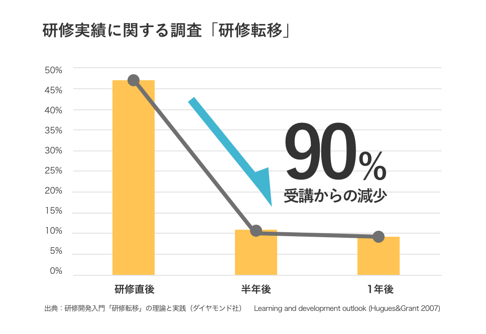 研修で学んだ内容を職場で実践する、という受講生は研修直後で約50%、半年先では約10%まで減少するといわれ、