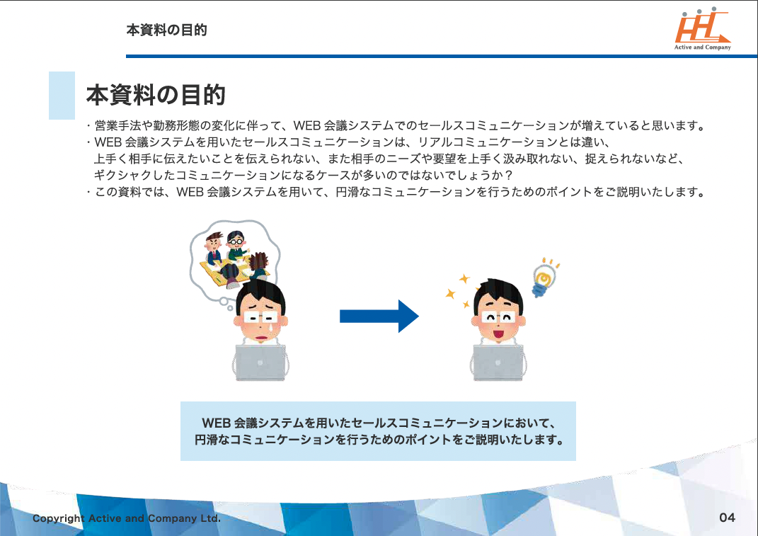 営業手法や勤務形態の変化に伴って、WEB会議システムでのセールスコミュニケーションが増えていると思います。この資料では、WEB会議システムを用いて、円滑なコミュニケーションを行うためのポイントをご説明します。