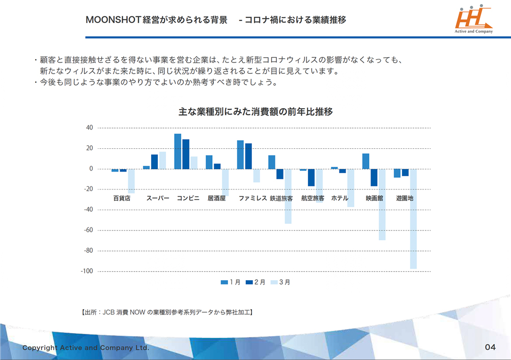 顧客と直接接触せざるを得ない事業を営む企業は、たとえ新型コロナウィルスの影響がなくなっても、新たなウィルスがまた来た時に、同じ状況が繰り返されることが目に見えています。