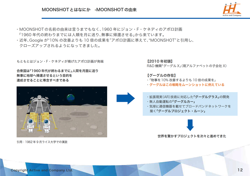 MOONSHOTの名前の由来は言うまでもなく、1960 年にジョン・F・ケネディのアポロ計画「1960 年代の終わりまでには人類を月に送り、無事に帰還させる」から来ています。