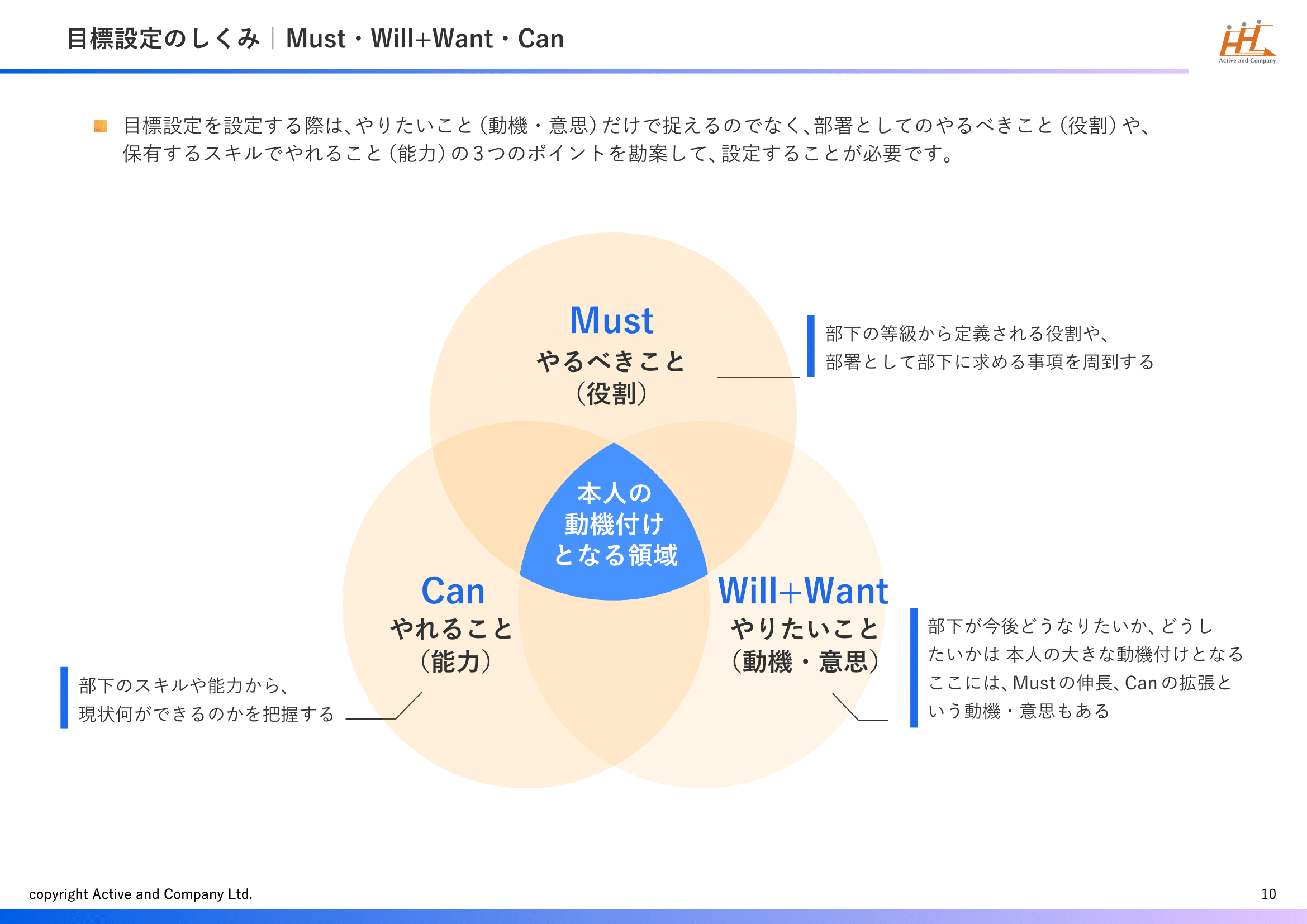 目標設定を設定する際は、やりたいこと(動機・意思)だけで捉えるのでなく、部署としてのやるべきこと(役割)や、保有するスキルでやれること(能力)の3つのポイントを勘案して、設定することが必要です。