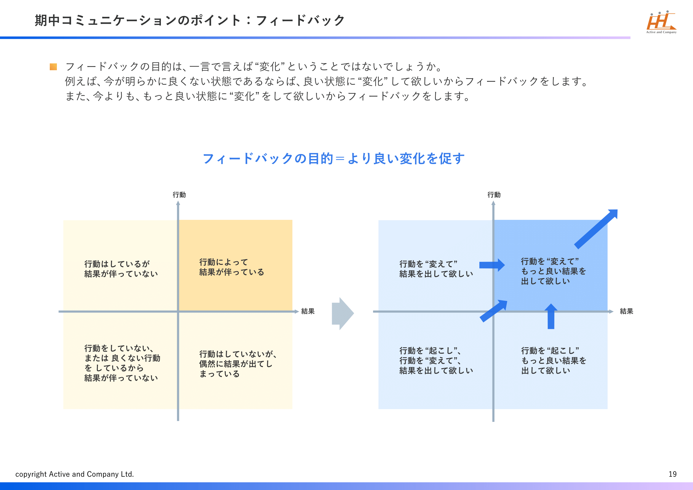 フィードバックの目的は、一言で言えば“変化”ということではないでしょうか。例えば、今が明らかに良くない状態であるならば、良い状態に“変化”して欲しいからフィードバックをします。また、今よりも、もっと良い状態に“変化”をして欲しいからフィードバックをします。