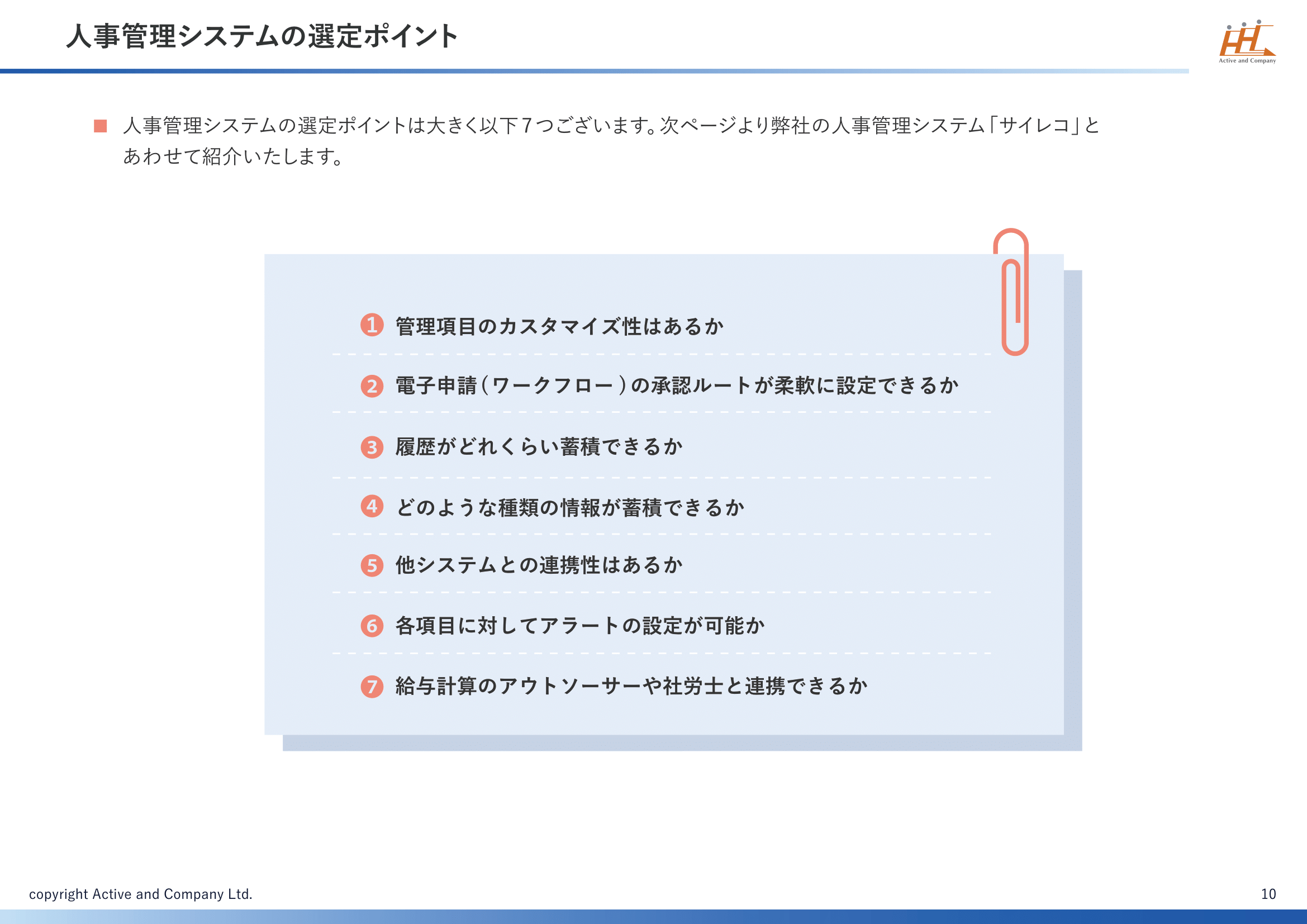 人事管理システムの選定ポイントは大きく以下7つございます。次ページより弊社の人事管理システム「サイレコ」とあわせて紹介いたします。