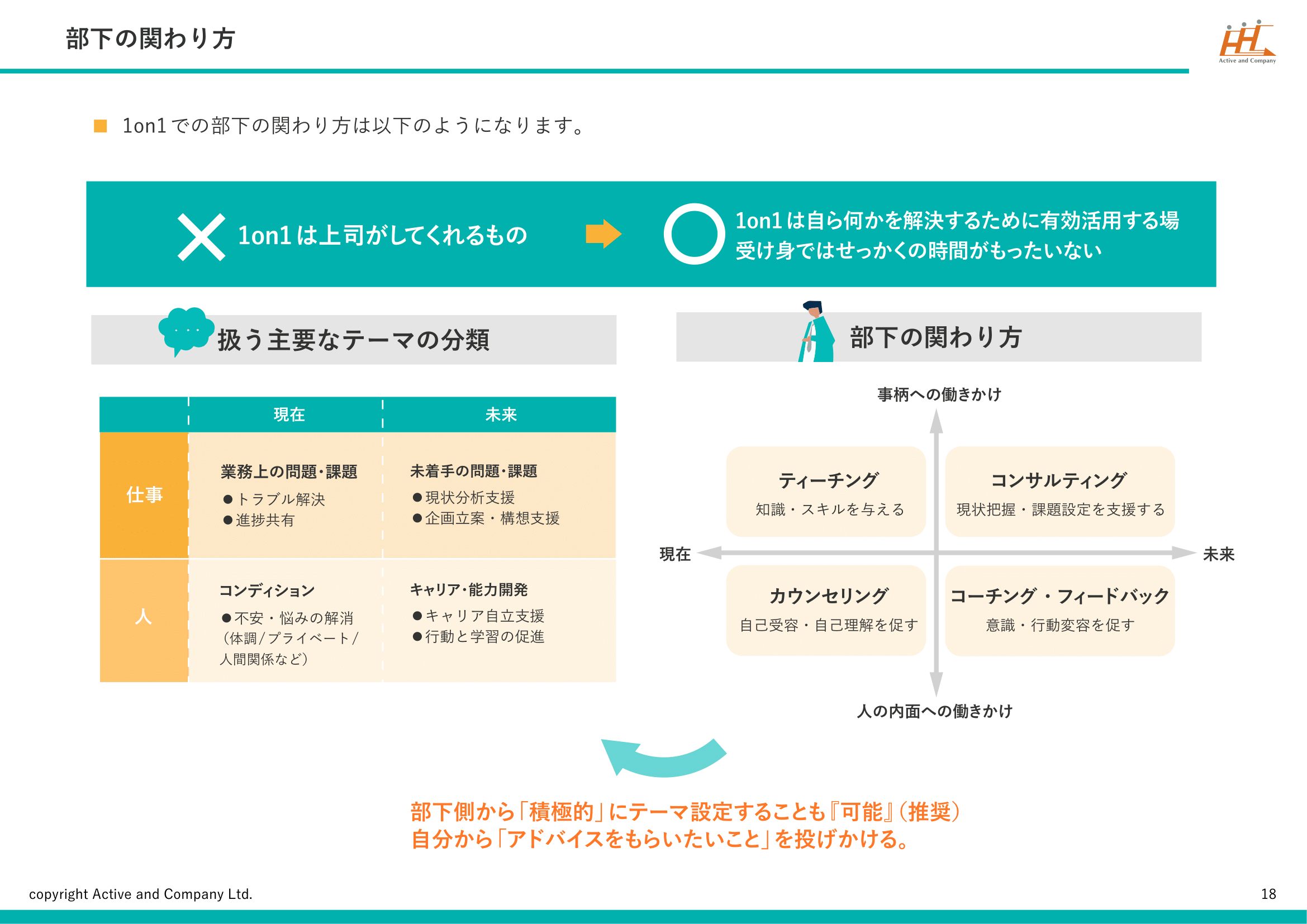 「1on1」ミーティングを行っても、従来の面談と大きな違いを感じられなかったり、部下の話を聴くといっても、コーチング的な促しや問い掛けを繰り返すだけで良いのか、あるいはアドバイスをすべきなのか、多くの方が戸惑っているのが現状です。