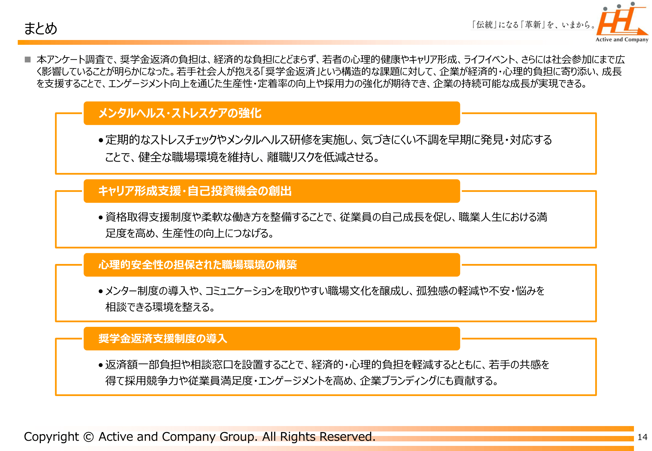 本アンケート調査で、返還負担は、若手社会人が更なる就学や起業といったチャレンジをしづらくするだけでなく、結婚や出産といったライフステージの変化にも積極的になれない状況を生み出していることがわかった。若手社会人が抱える「奨学金返済」という構造的な課題に対して、企業は以下の施策に取り組むことで、採用競争力や定着率、組織エンゲージメントを高め、中長期的な企業価値の向上が可能である。