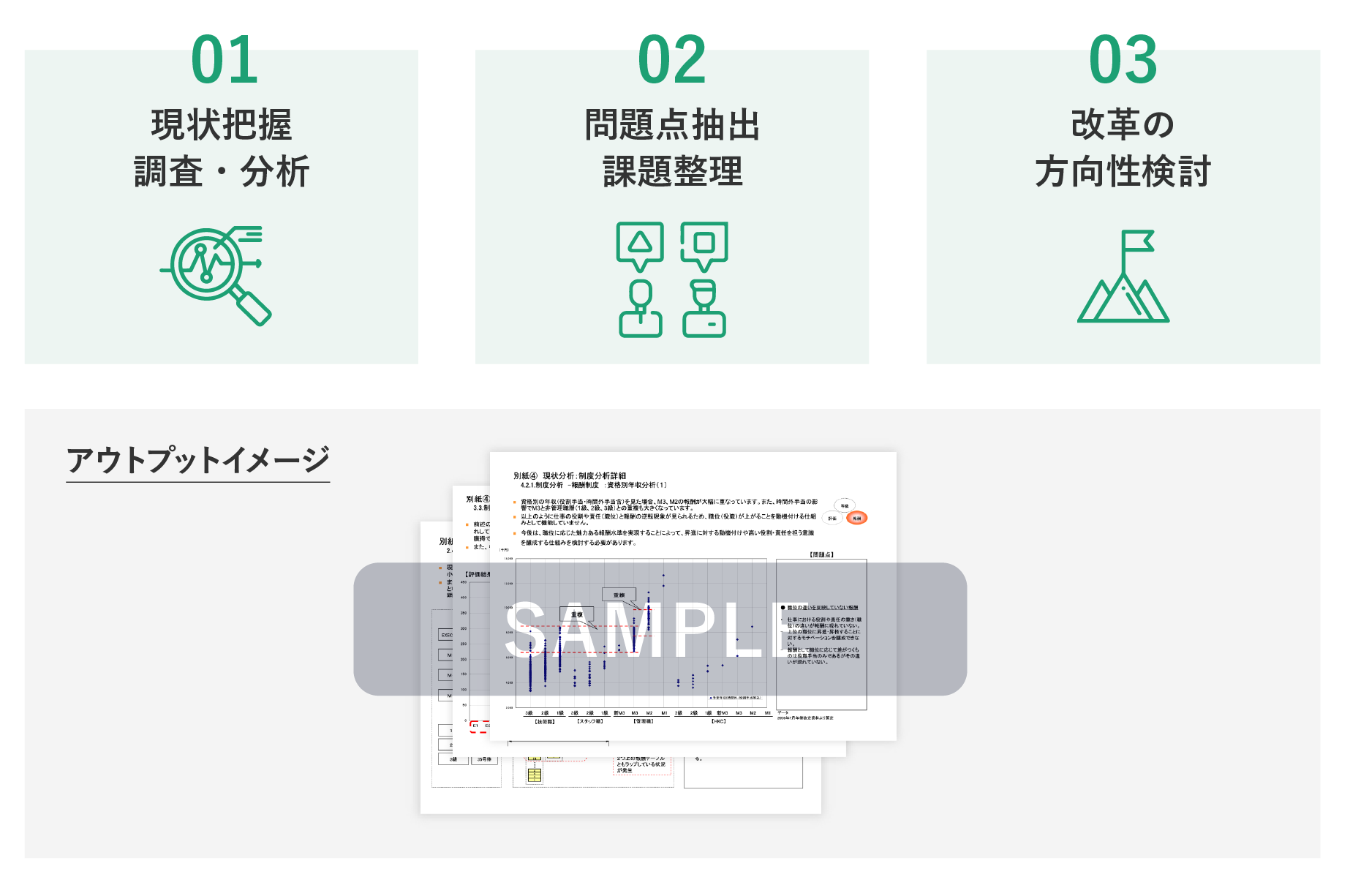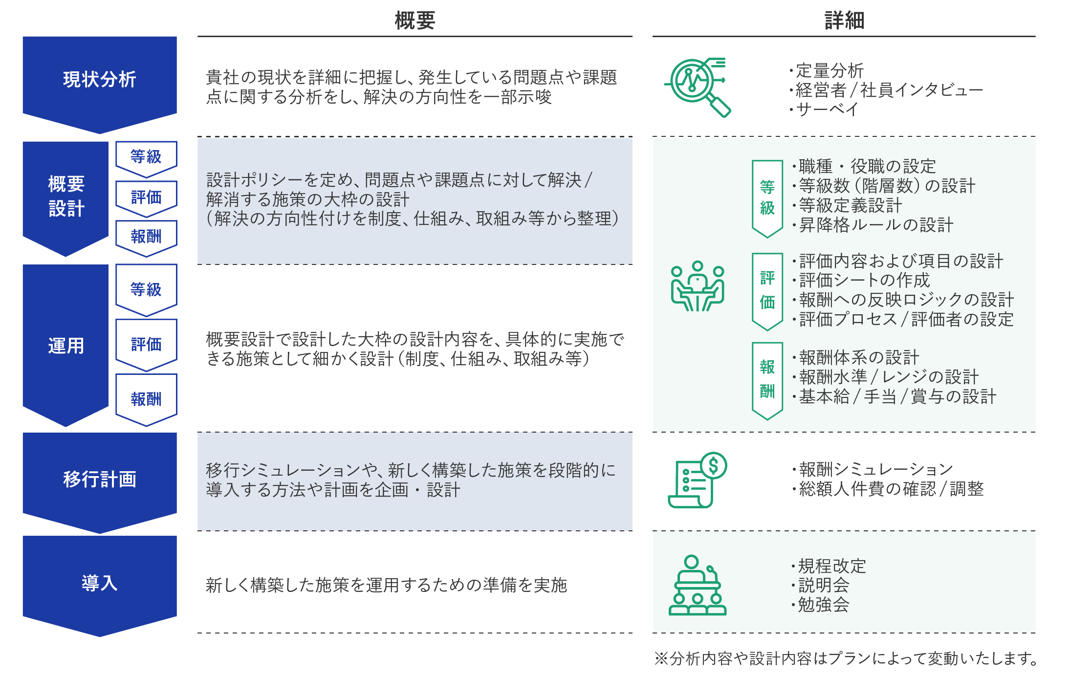 各制度の整合性を鑑み、従業員にとって透明性・納得性のある制度構築を行える様、現状分析で詳細把握・分析した問題点や課題点に対して、解決/解消する仕組みの大枠を設計します。