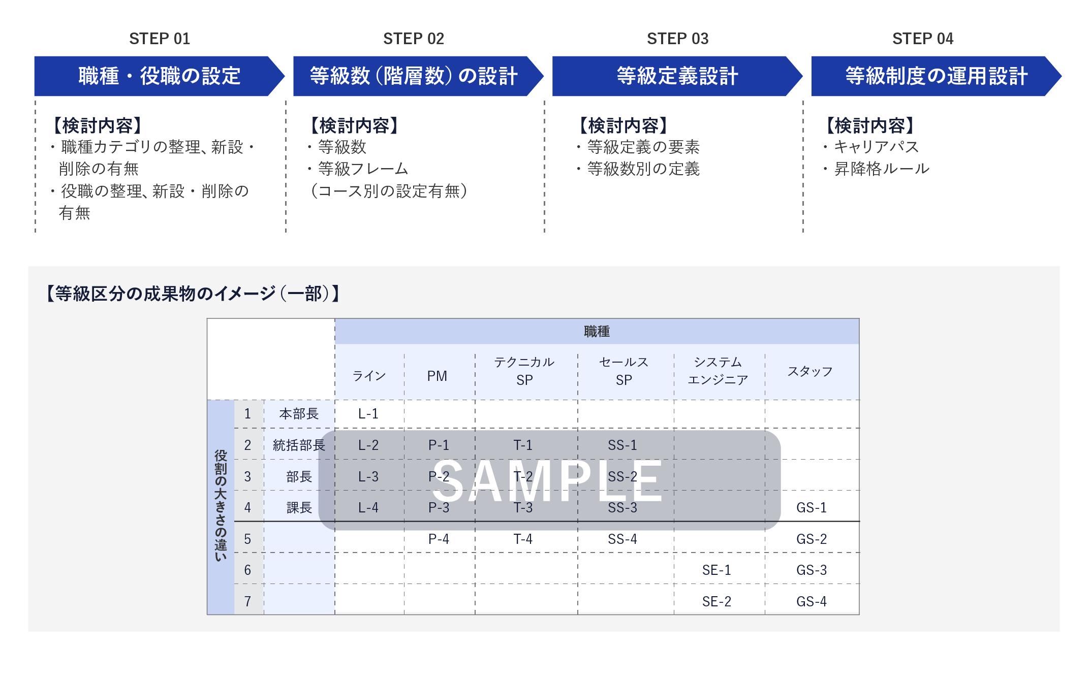 等級制度は人事制度構築における基軸となる重要な役割を担っているため、企業理念や人材ポリシーから落とし込み、設計します。