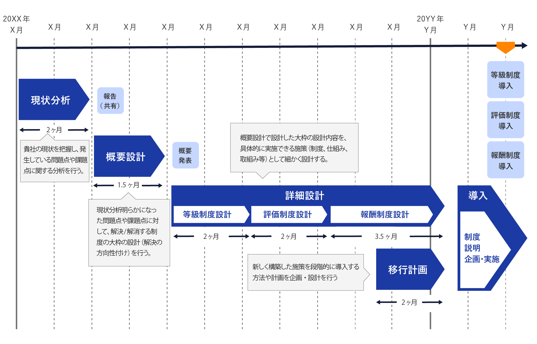 現⾏制度と新制度に⼤きな乖離があり、新しく構築した施策を段階的に導⼊する必要がある場合においては、新施策をソフトランディングに導⼊する⽅法や計画を企画‧設計します。