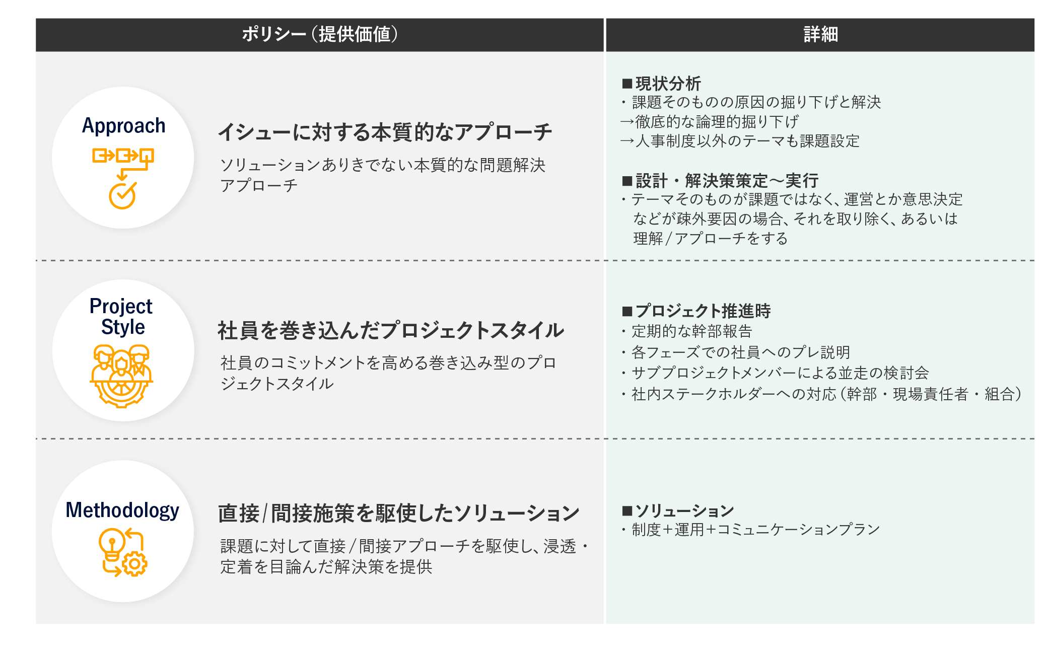 また、貴社経営陣及びプロジェクトメンバーと再三議論を重ね構築した⼈事制度であっても、⼀⽅的な情報伝達ではなく、双⽅向の交流が図れる場を活⽤し、周知徹底を図ることで共鳴者を創り上げる⽀援を実施します。結果として、従業員の⼗分な理解、納得を得ることが可能となり、⼈事制度の早期定着‧浸透に繋げます。
